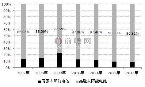 数据显示,从全球太阳能电池产品结构来看,2007-2009年薄膜太阳能电池发展迅速,所占比例稳步提高,成为太阳能电池领域的又一热点。2010年晶体硅太阳能电池产量占比有所上升,晶体硅太阳能电池和薄膜太阳能电池分别占整个太阳能电池产量的87.06%和12.94%。2013年,晶体硅太阳能电池和薄膜太阳能电池分别占整个太阳能电池产量的90.92%和9.08%。