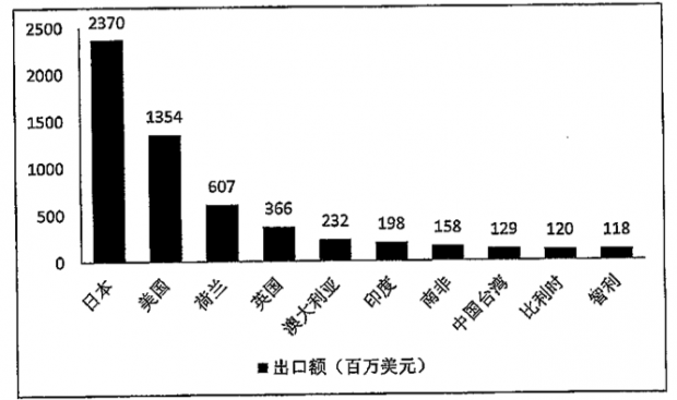 根据中国光伏行业协会秘书处数据显示,2014年上半年中国太阳电池产量约14GW,其中出口额约5.2亿美元,出口量约1.4GW,出口至92个国家或地区,其中最大出口国为韩国,出口金额达1.38亿美元,其次为加拿大,出口金额为1.19亿美元,出口欧洲约0.94亿美元。前十出口地为韩国]加拿大、印度、日本、德国、意大利、中国台湾、中国香港、奥地利、南非。