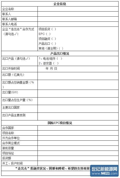 9月18日,中国光伏专委会收到国家能源局通知,要求组织开展光伏企业“走出去”项目情况的调研活动,由中国光伏专委会负责落实具体工作,具体调研收集信息如下表。请各相关企业将信息整理后以邮件的方式发送至cres-pv@mail.iee.ac.cn(截止时间2014年09月18日17:00)