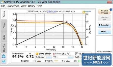20年后,Wind&Sun公司对该阵列重新进行了测试。测试包括组件完整的IV曲线,开路电压、短路电流,并测量了太阳辐照度和组件背面温度。根据测试结果,对比初始出厂安装时的组件功率测试数据。