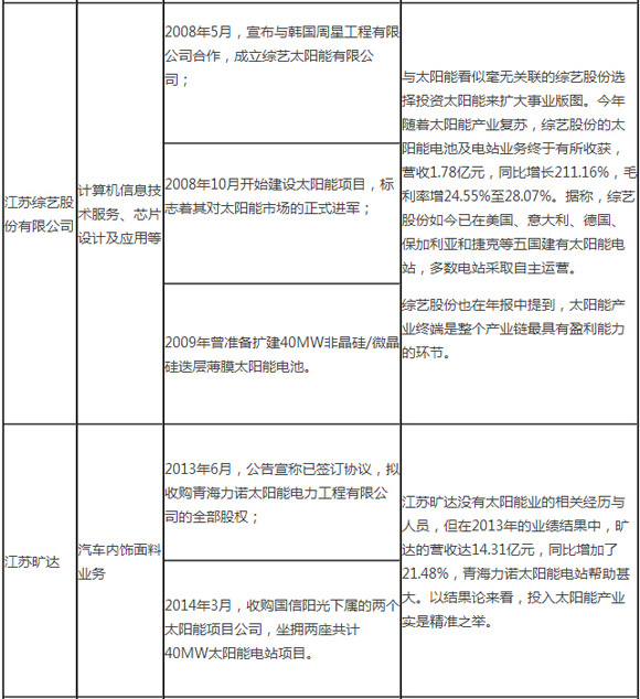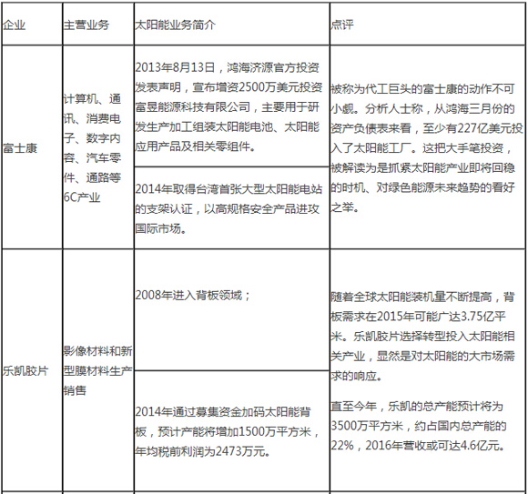 除了这三家大名鼎鼎的科技公司之外,也有不少行业看中太阳能大饼,纷纷向它伸出金融之手。上述11家非传统太阳能企业对太阳能业务的投资,有的是趁去年太阳能行业低潮时抢入,有的是今年太阳能产业回暖时抢滩。不管投入太阳能业务的时机为何,他们都看中了太阳能产业的诱人吸金能力与发展前景。随着各方面对太阳能行业,特别是中国市场的看好,接下来其他企业还会不会有动作、投入太阳能行业是不是就能分得一杯羹,这些都还是未知数。但现在我们所能看到的是,太阳能,它真的已经很火了。