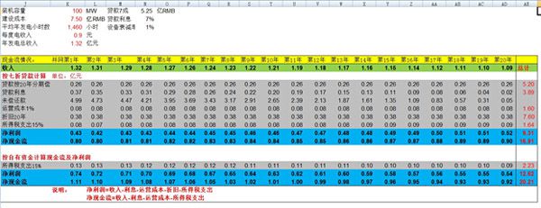 这是第一年的数据,因为电站建好后,只要有发电,就会源源不断的收入,所以现金流会很好,考虑到衰减率的因素及利息每年减少的情况,接下来每年的数据演变情况如下表: