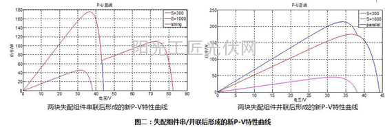 不同厂家、不同型号、以及不同生产批次的光伏组件,P-V特性曲线并不完全一致;在不同光照、不同温度以及不同衰减下,各组件的特性曲线也会不一致。简单来说,一个阵列内同一时间不同组件的P-V特性曲线不一致,就是组件失配。由失配的组件进行串联或并联,形成新的组合功率曲线,如图二所示。新组合曲线的最大功率输出,将小于组合前各功率曲线最大功率输出之和,这就是组件失配导致的功率损失。