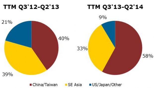 巴克尔表示,未来几个季度,由于下游参与者解决当前的库存水平,并且制造商等待美国政府预计将于2014年十二月到来的最终贸易决定,中国大陆或台湾的出货量份额可能下滑。