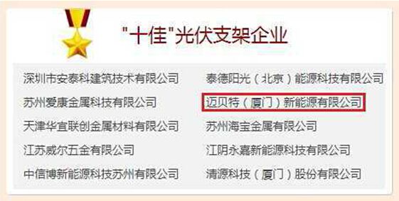 索比光伏网讯:历经20天的北极星网线上投票,迈贝特最终以26982票的高票成绩成功入选2014“北极星杯”最受欢迎十佳光伏企业之十佳光伏支架企业。本次评选由北极星网与中国(无锡)国际新能源大会暨展览会(CREC)联合举办,依托北极星太阳能光伏网15万/天的在线用户,投票全程客观、公正。