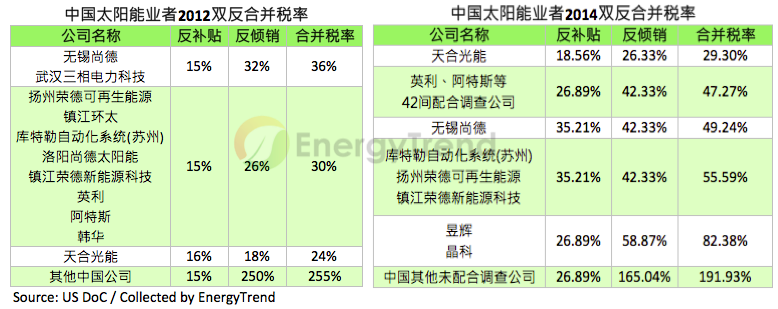 TrendForce旗下新能源事业处EnergyTrend研究经理黄公晖指出,相较于2014年中美双反版本最初提出的范围,此次修改简化了判断依据,加强封堵中国制组件。原先范围中,若中国制组件采用非中国硅片及非中国、台湾制电池片,可能可以顺利避免双反课税;但本次提出的调查范围修改,对先前被判以高额税率的厂商如英利、尚德、晶科等不利。若这些公司仍选择在中国生产产品,则势必要用自产电池片。以2012年的税率应对,对台湾以及第三地电池片的采购需求将大幅缩减。