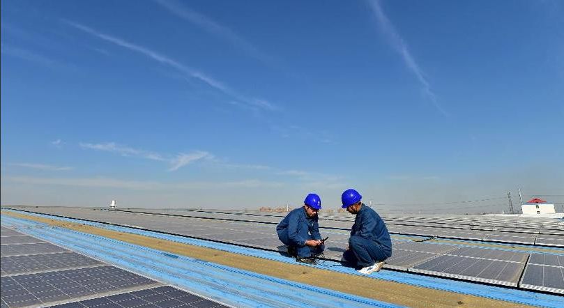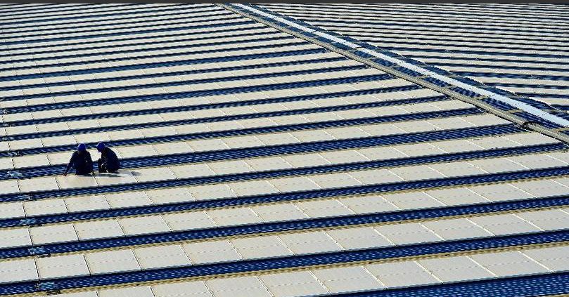 10月16日,在山东省淄博市高新区德诺铝业有限公司的厂房屋顶光伏发电站,淄博供电公司工作人员在送电前为光伏发电线路做检查。
