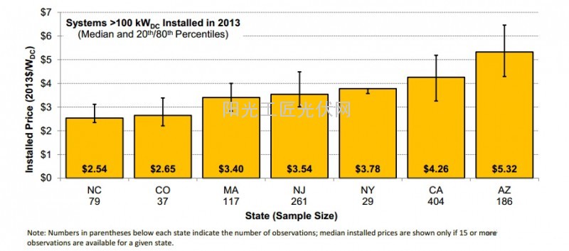 ·就装机量小于10kW住宅/商业系统而言,最高州与最低州之间的报告差价约为每瓦2.00美元;各州内部之间的价格差幅与此相似