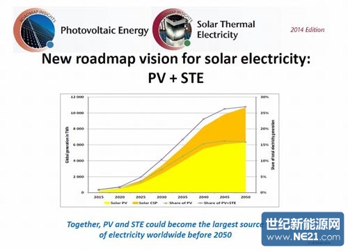 IEA提出的技术发展蓝图显示,2050年之前,在全球所有的电源中光伏发电将占16%,聚光型太阳热发电(CSP)将占11%,合计将超过其他电力源。