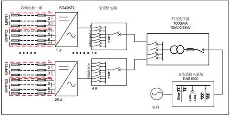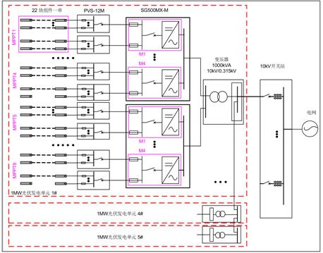 山丘电站地处山地或丘陵,地势起伏,一般规模较大,并入输电网,综合前期组件铺设的选址规划,推荐选用多MPPT集中型逆变器,即具有多路MPPT功能的集中型逆变器;在非常复杂的山丘地形中,如实现100KW组件同一朝向铺设难度大,可以考虑组串型方案。以1MW单元为例,典型的山丘电站多MPPT集中型方案配置和系统图如下: