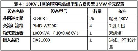 建筑屋顶结构复杂,多存在遮挡和朝向不一致情况,推荐选用组串型逆变器;有的工业厂房屋顶是彩钢材质,承重有限,也可以选用集中型方案。以1MW单元为例,典型的10KV并网的屋顶电站组串型方案配置和系统图如下: