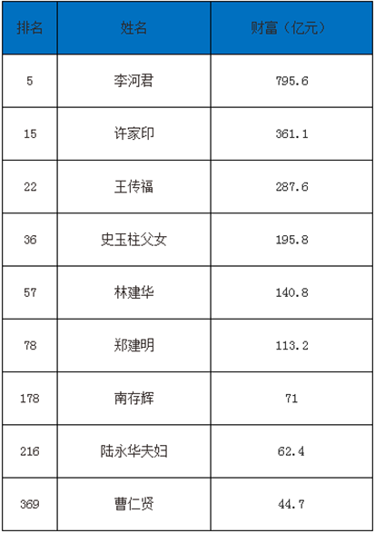 No.216 陆永华夫妇以62.4亿元的财富排在第216名。陆永华,现任林洋电子董事长兼总经理,2012年3月份,林洋电子发布公告称,公司将投资1亿元人民币设立林洋新能源科技有限公司(以下简称林洋新能源),主要从事光伏系统产品设计、光伏电站工程、能效管理和LED应用等业务。2010年卖掉股份,退出光伏圈的陆永华,又用另外一种方式回归了,公司依旧取名林洋新能源。在接受媒体访问时,陆永华称:“一直看好光伏行业,这个行业依然是个蓝海。”2014年上半年公司实现营收8.44亿元,同比增长10.83%;实现归属于上市公司股东净利润1.35亿元,同比增长15.47%,对应EPS约0.38元。