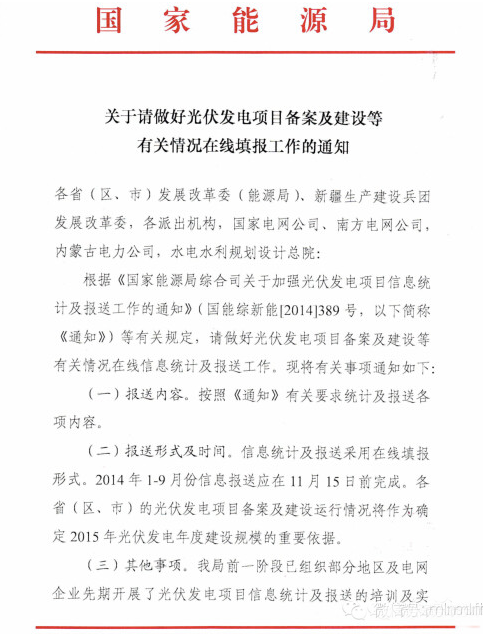 根据《国家能源局综合司关于加强光伏发电项目信息统计及报送工作的通知》(国能综新能【2014】389号,以下简称《通知》)等有关规定,请做好光伏发电项目各案及建设等有关情况在线信息统计及报送工作。现将有关事项通知如下: