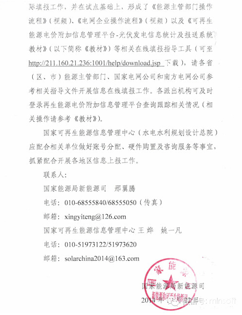 (三)其他事项。我局前一阶段已组织部分地区及电网企业先期开展了光伏发电项目信息统计及报送的培训及实际填报工作,并在试点基础上,形成了《能源主管部门操作流程》(视频)、《电网企业操作流程》(视频)以及《可再生能源电价附加信息管理平台-光伏发电信息统计及报送系统教材》(以下简称《教材》)等相关在线填报指导工具(可至http://211.160.21.236:1001/help/download.jsp下载),请各省(区、市)能源主管部门、国家电网公司和南方电网公司参考相关指导文件开展信息在线填报工作。各派出机构可及时登录再生能源电价附加信息管理平台查询跟踪相关情况(相关操作请参考《教材》)。