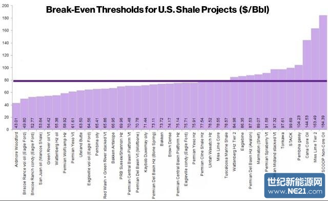 也有分析者认为,即使油价跌破80美元/桶,包括Bakken和Eagle Ford这两大最重要页岩油产区在内的页岩油仍然可以实现盈利,甚至Eagle Ford地区的部分项目在油价跌至50美元时也能盈利。以下是一张页岩项目的盈亏平衡点示意图