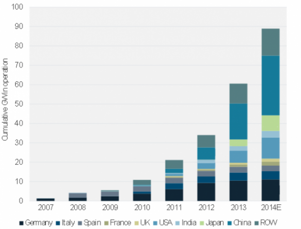 该新的报告强调,全球光伏运营和维护市场应该在2014年超过88GW,并且毫无意外由中国主导,中国去年安装超过10GW,预计2014年至少安装13GW。