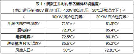 从实测数据比较看,同等工作环境满载稳定运行,20KW自冷逆变器较30KW风冷逆变器机箱内各器件工作温度要高10℃左右。