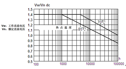 根据对样本产品的内部温度实测数据,假定纹波电流相同,以1.1倍额定电压工作(曲线倾斜度一致,便于读值选取1.1倍,不影响比较结果),根据图1曲线可获得两者膜电容寿命对比如表2。