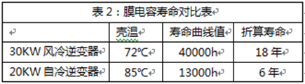 在关键器件膜电容上,风冷散热工作环境下的器件寿命,是自冷散热工作环境下的器件寿命的三倍。
