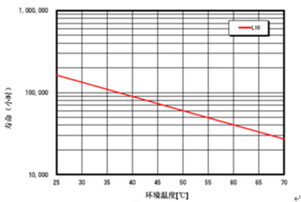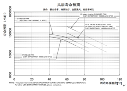 以三洋风扇为例,风扇寿命受温度影响的关系曲线如图2。根据对样本产品的内部温度实测数据,根据图2曲线可获得两者风扇寿命对比如表3: