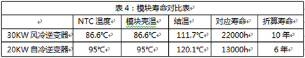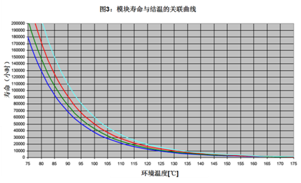模块作为逆变器最为核心器件,其工作时内部结温直接影响使用寿命,图3是英飞凌提供的晶元结温与寿命对应关系曲线。根据对样本产品的内部温度实测数据,推算出模块结温和两者模块寿命对比如表4(推算过程专业性强,这里不在赘述)。