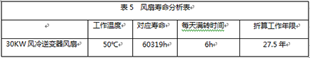 根据图4,以逆变器运行的最高环境温度50度计算,正常运行时间为60319小时。通过智能强制风冷控制,只有逆变器的模块温度达到70度以上,风扇才会满转,在正常一天内,满足满转条件的时间大概在6小时左右,一年为365天,可得风扇使用寿命如表5。