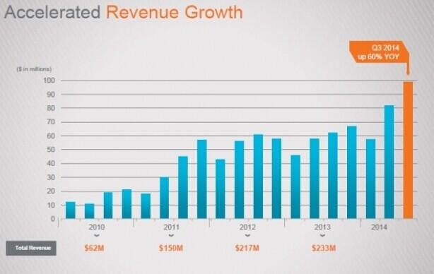 Enphase报告2014年第三季度收入为9910万美元,较上季度8200万美元有所提高。年同比收入增长60%,季度同比增长21%。