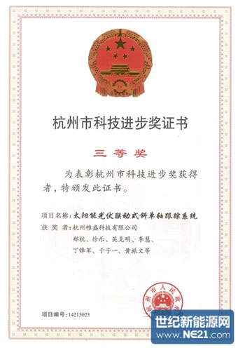 近日,帷盛“太阳能光伏联动式斜单轴跟踪系统”技术荣获杭州市科技进步奖。