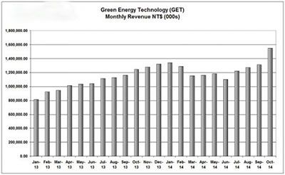 索比光伏网讯:台湾硅片生产商绿能科技(GET)报告,十月销售额提高18%,达到15.47亿新台币(5049万美元)新的月度收入记录。