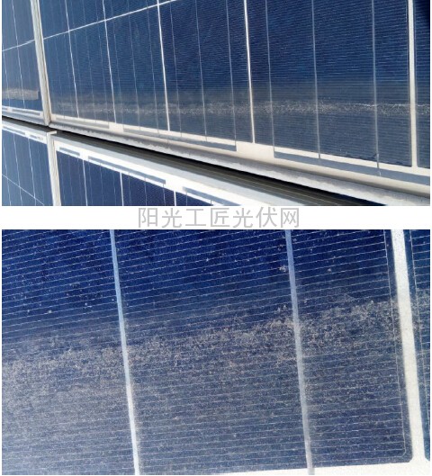 图三,积水蒸发后:组件底端留下大量积灰及水碱带。