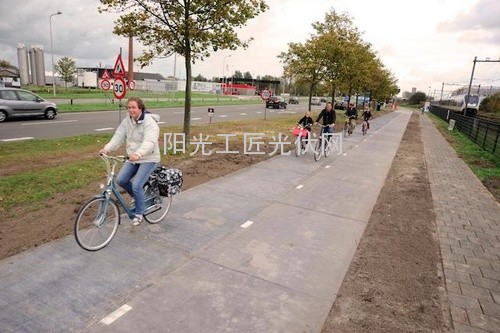 当地时间2014年11月13日报道,荷兰建成开通全世界首条太阳能自行车道,并将对民众开放。这条“太阳路”贯穿阿姆斯特丹北部郊区克罗曼尼,该太阳能自行车道长约70米,在水泥板里嵌入了晶体硅太阳能电池板,可将太阳能转化成电,并输送给电网。而道路最外层是起到保护作用的保温玻璃层,外层路面是透明的,以保证阳光可以射入,但也相当坚固。据报道,该项目总花费约合人民币2300万元,这条太阳能自行车道预计能提供足够三户家庭的用电。
