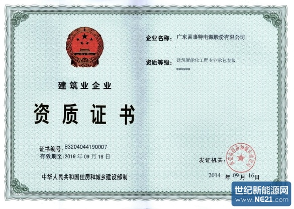 近日,广东易事特电源股份有限公司成功获得由东莞市住房和城乡建设局颁发的《建筑智能化工程专业承包叁级资质证书》,这是易事特在建筑智能化领域的又一项突破,标志着易事特正式具备承担建筑智能化工程项目的资质,为易事特未来承担IDC数据中心机房等大型智能化工程项目扫清了障碍。