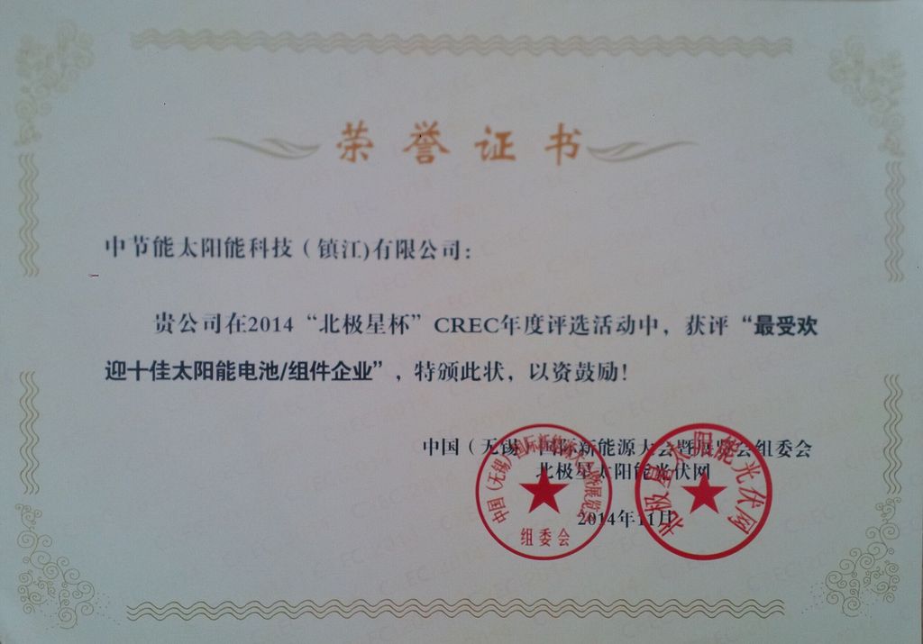 索比光伏网讯:近期,由国内知名光伏媒体北极星太阳能光伏网与中国(无锡)国际新能源大会暨展览会(CREC)联合举办的2014“北极星杯”CREC年度最受欢迎十佳光伏企业评选活动正式落下帷幕。中节能太阳能科技(镇江)有限公司凭借在光伏市场的优异表现,赢得了组委会和广大票选网友的认可,斩获了“‘十佳’太阳能电池/组件企业”的荣誉称号。