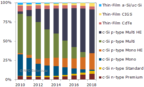 Colville表示:“从太阳能产业成长初期到2012年,多种不同的太阳能制造技术类型相互竞争,共同发展。这就很难形成一个具体的技术蓝图,以预测产业技术发展趋势。”根据NPDSolarbuzz报告显示,薄膜和高效晶矽模组的供应量将从2014年的5.3GW成长至2018年的14.5GW。高效晶矽技术方面的新增厂商包括SolarCity计划扩大Silevo的产能,以及FirstSolar将TetraSun的太阳能技术进行量产。