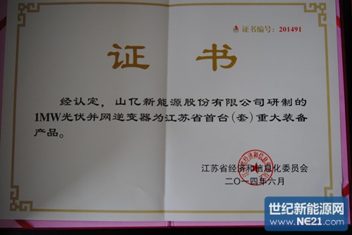 来源:世纪新能源网发布时间:2014-11-19 23:59:59 索比光伏网讯:近期,从江苏省经济和信息化委员会传来喜讯, 山亿新能源股份有限公司(以下简称”山亿新能源”)1MW光伏并网逆变器获江苏省首台(套)重大装备及关键部件认定,受资助30万元。