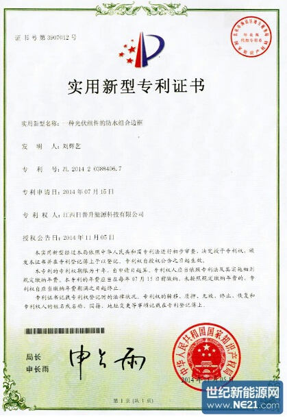 日前,日普升又一项实用新型专利获得国家知识产权局授权,此项专利名称为“一种光伏组件的防水组合边框”,专利号为:ZL201420388406.7。