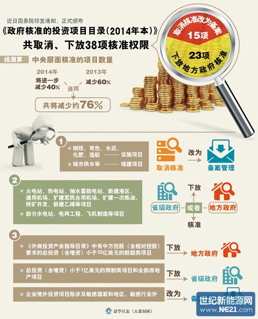 “按照国务院第45次常务会议关于精简审批事项、激发市场活力的要求,我们会同有关部门在2013年对政府核准的投资项目目录进行了修订,今年又再次作出修订,形成了《政府核准的投资项目目录(2014年本)》(以下简称《目录》)。”国家发改委秘书长李朴民在11月18日举办的新闻发布会上介绍,《目录》共包括12个部分,其中的亮点内容可以简单概括为六个字:取消、下放、监管。