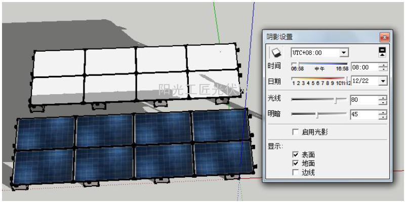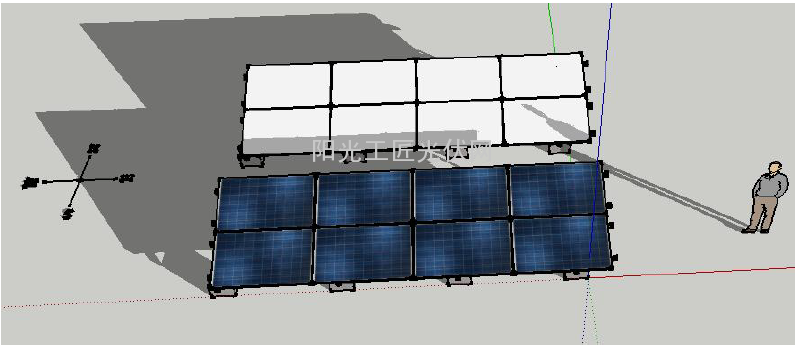 SketchUp中的阴影分析功能,可以精确计算光伏发电系统中的光伏方阵的排间距。步骤如下: 1、绘制光伏组件方阵。注意最好将光伏电池板颜色设臵成纯白色,以便于观察电池板上是否有阴影遮挡。