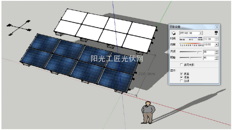 如图可以测量出,在倾角为20°的情况下,上海地区组件横向2段布臵的阵列间距为3195mm。