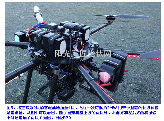 图5:将正常为2块的蓄电池增加至4块,飞行一次可航拍2MW 用带子捆着的长方体就是蓄电池。从图中可以看出,除了圆形机身上方的两块外,右前方和左后方的机械臂中间还追加了两块