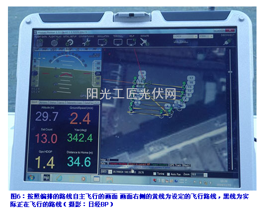 追加蓄电池是为了延长飞行时间,不用更换电池就可航拍整个百万瓦级光伏电站(图5)。充满电后可飞行约20分钟。这期间能航拍面积约4公顷、输出功率约2MW的百万瓦级光伏电站的太阳能电池板。