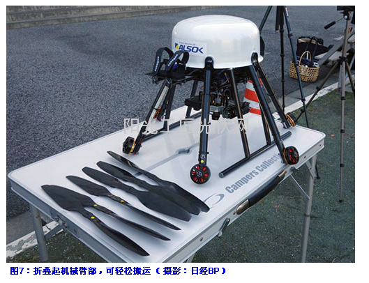 为了让任何人都能安全、正确地操作而采取的措施,也是无人直升机原来就具备的要素。折叠起支撑6个螺旋桨的机械臂之后能收纳在小箱子中,可用汽车轻松搬运(图7)。采用了利用普通工具就能完成组装和折叠的设计。这一点也与综合警备保障公司的需求相符。