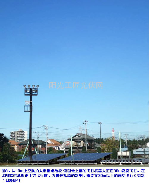 图8:从40m上空航拍太阳能电池板 该图最上部的飞行机器人正在30m高度飞行。在太阳能电池板正上方飞行时,为避开乱流的影响,需要在30m以上的高空飞行