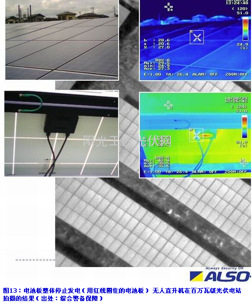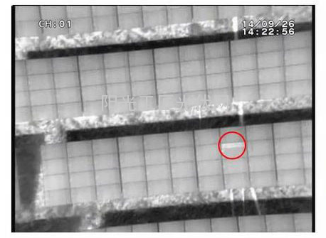 图像是红外相机和普通相机同时拍摄的。由此可确认热分布存在异常的部分以及该部分的电池板表面状态。该公司称,在验证实验和试用服务中,已经掌握了诸如: 热点发生(图9)、鸟粪附着(图10)、随电池单元输出异常(发电元件,图11)的旁路二极管回避、被杂草覆盖导致输出功率部分降低(图12)、接线盒故 障导致电池板整体停止发电(图13)、玻璃破碎等问题。玻璃破碎一般很难通过图像辨别,但无人直升机采用的是1920×1080像素的高分辨率相机,因此 能够辨别出来。