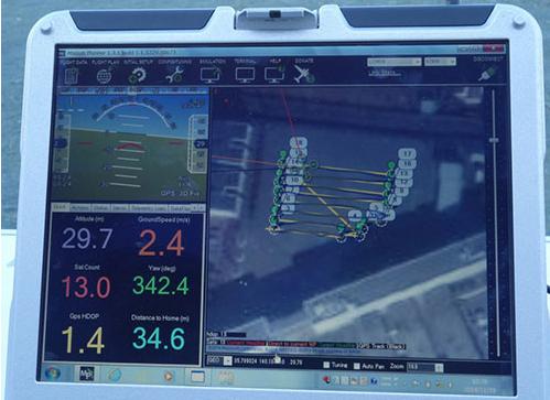 图6:按照编排的路线自主飞行的画面画面右侧的黄线为设定的飞行路线,黑线为实际正在飞行的路线.