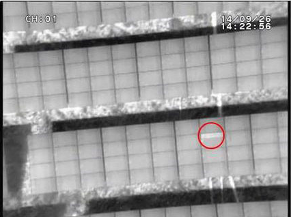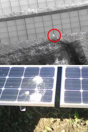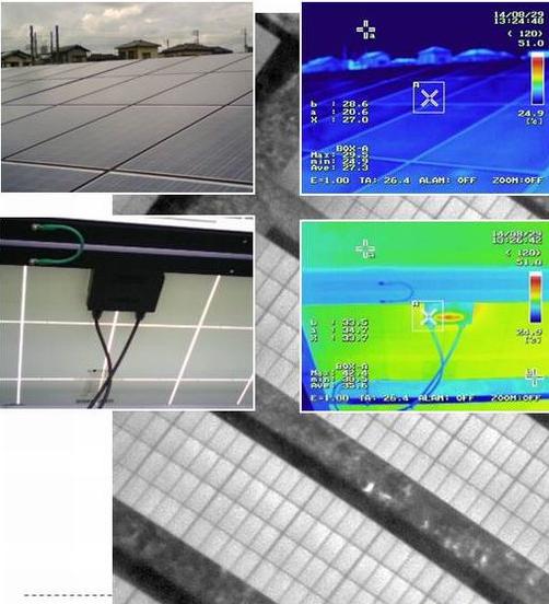图像是红外相机和普通相机同时拍摄的。由此可确认热分布存在异常的部分以及该部分的电池板表面状态。该公司称,在验证实验和试用服务中,已经掌握了诸如:热点发生(图9)、鸟粪附着(图10)、随电池单元输出异常(发电元件,图11)的旁路二极管回避、被杂草覆盖导致输出功率部分降低(图12)、接线盒故障导致电池板整体停止发电(图13)、玻璃破碎等问题。玻璃破碎一般很难通过图像辨别,但无人直升机采用的是1920×1080像素的高分辨率相机,因此能够辨别出来。