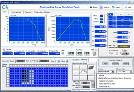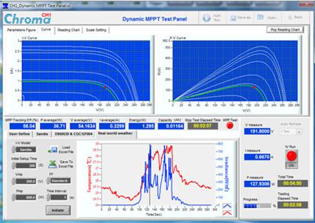 致茂最新推出型号62020H-150S太阳能电池模拟器内建1,000种太阳电池模组资料,使用者可从资料库内选择太阳电池模组型号,然后可自行规划成PVString或PVArray阵列,接续使用者可设定PVModule的照度、温度参数及动态遮罩变化移动方向及时间,此可模拟实际云遮变化或其它如树木或建筑物遮罩下的ShadowI-V曲线模拟(图一),每条I-V曲线为最多达4096点的电压及电流组成,另外提供真实天候模拟功能(图二)允许使用者将特定区域所记录的温度及照度参数(0.1s解析度)输入进行测试光伏逆变器的动态最大功率追踪效率,此可非常容易控制及重复性模拟以测试逆变器最大功率演算法及MPPT效率性能提升达到光伏系统发电最佳化。