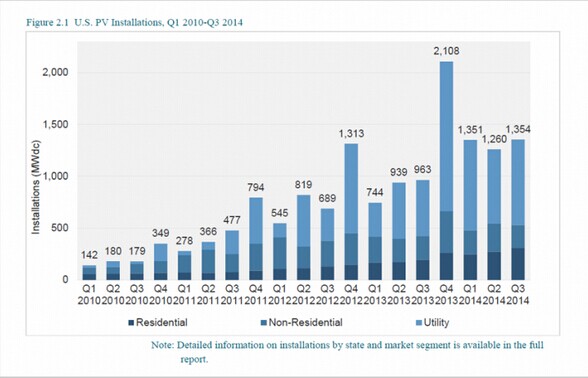 根据美国光伏产业协会与GTM Research联合发布的一份分析报告称,2014年第三季度,美国太阳能光伏发电项目安装总量达到1,354MW,较去年同期上涨逾40%。目前,该国光伏系统装机总量约为17,500MW,足够向美国大约280万户普通家庭供应电力。