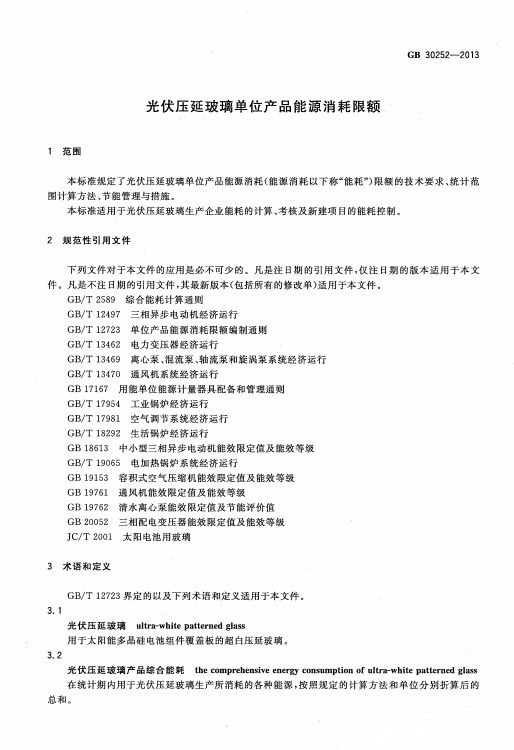 原标题:国标:GB30252-2013光伏压延玻璃单位产品能源消耗限额实施
