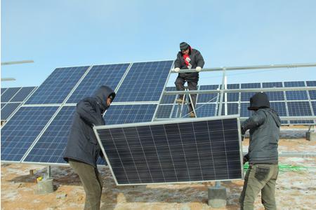 索比光伏网讯:2014年12月17日,中电投中旗光伏发电有限公司3万千瓦光伏项目进入面板安装阶段,工程技术人员和当地民工冒着零下十几度的严寒正在紧张施工,项目预计年底前并网发电。